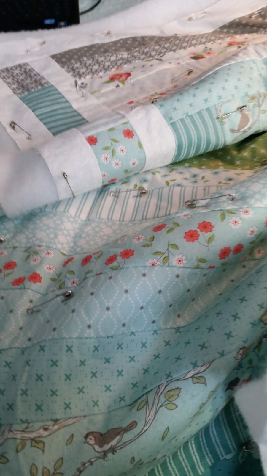 First off, I have to say that I just love this quilt! I love the simplicity of it, the colors, the fabrics, the size, etc. The fabric line is from Moda and it's called, "Nest." It has images of little birds in their nests with pretty coordinating fabrics in teal, gray and coral colors. And it's just the right size to have as a throw when you want to snuggle up on the couch watching a move or relaxing.