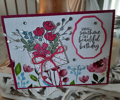 For my cards this week, I paired the Fancy Flora designer papers with Rejoice in Him. This card is my version of the one in the catalog. I added the sprig and some cut out flowers from the Queen Bee dies to my card. The saying is embossed and Jesus is painted using the ink from the stamp pads. I love the peaceful look of this card. :)